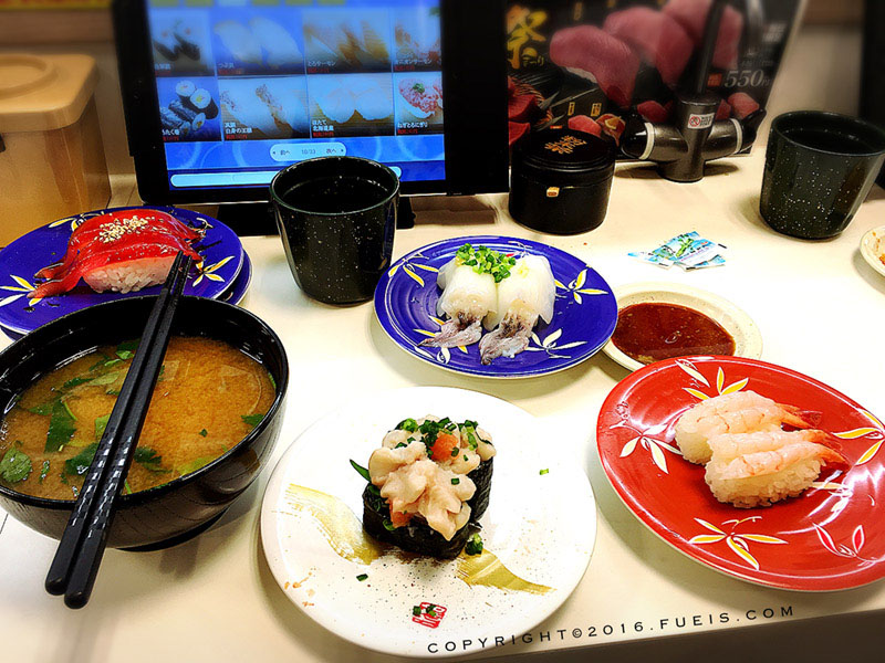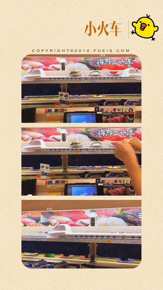 就是这是一家回转寿司,图片应该能看到有两个传送带,下面那个就是一直在转的想吃什么就拿什么。