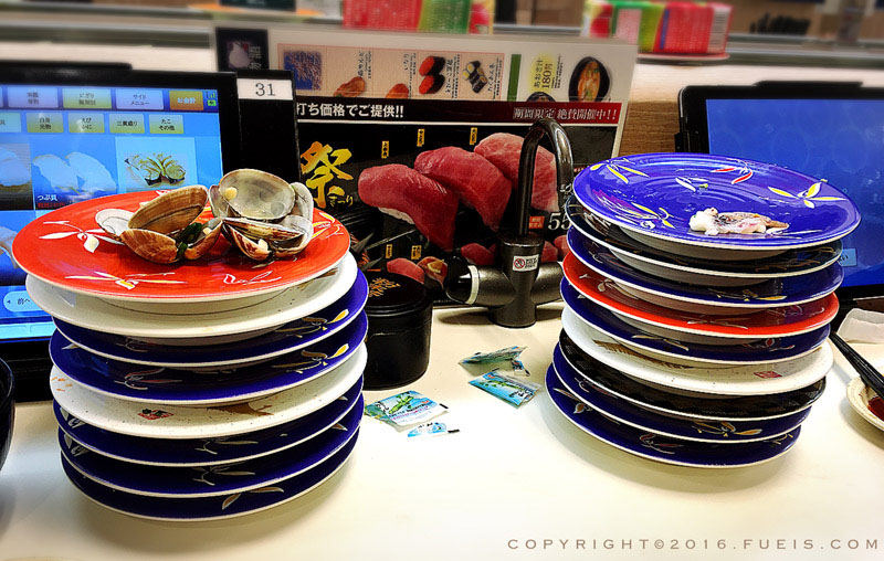 然后吧,我们一共吃了17碟,包括两碗汤所以寿司一共是吃了15碟。