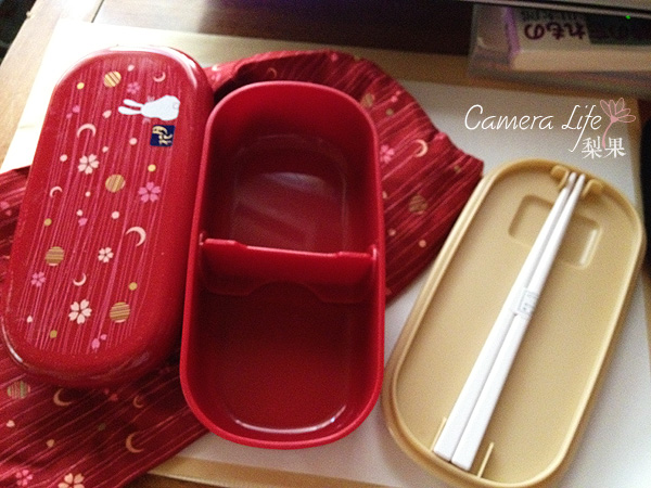 于是这个便当盒超漂亮的而且还送个小筷子=v=这便当盒有2层,左边那个是下面那层放饭的(我把盖子盖上去了镜头不够大哈哈),中间那个有隔开的是放菜的=v=