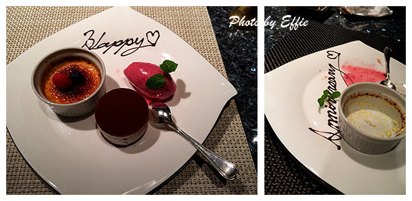 这个也是给我们的service!原本午餐后面附的只是一个冰淇淋,可是厨房的人都知道我这次来吃是因为三周年所以就给我们弄了特殊的纪念日甜点。实在实在是太幸福了!!!虽然那个咖啡色的小蛋糕,厨师当初在试做的时候我吃过好大一整个的!