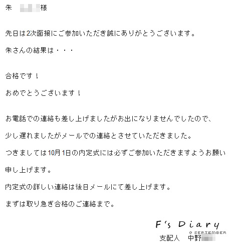 周一的时候有个电话没接到,之后也没给我继续打了╯﹏╰虽然看电话号码就知道是来通知面试结果的,但也不好贸贸然回拨过去。就想着等邮件吧,结果等到今天才发来!!!我还以为面试没合格呢!!!