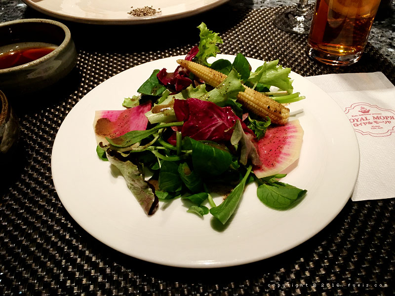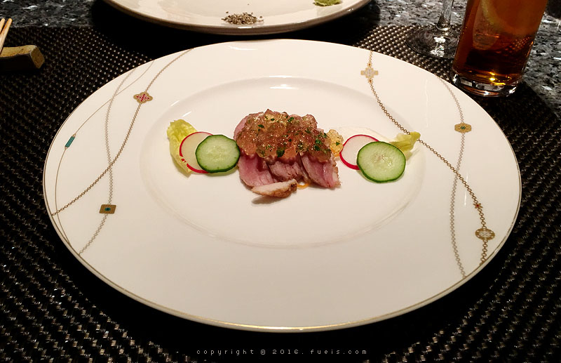 今天点的套餐是特殊套餐,这是肉之前上的一个鱼料理。这个应该是三文鱼?旁边的酱也都是店里自制的,还不错吃!