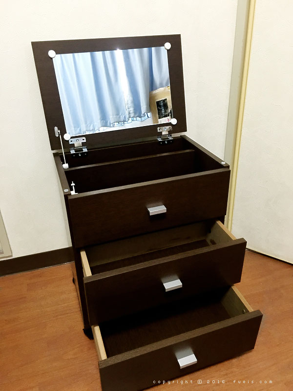平时化妆的时候可以把这块板打开,从抽屉里拿出今天要用的东西放着。所以感觉这个设计很方便的说!