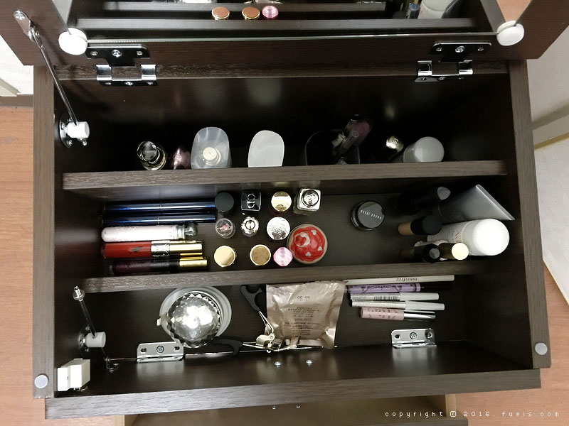 最里面一层比较深,就放现在在用的保养品和刷子之类的。中间那格放了些口红睫毛膏之类的,最外面那格因为外面那块板可以打开就没放什么东西。