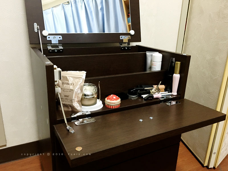 只不过这台子的高度我只有坐在地上化妆的时候可以用到这面镜子……